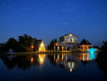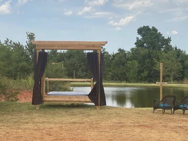 Experience an authentic African getaway in Oklahoma at African Manor Hut #3, where two traditional bush huts encircle a tranquil lagoon. Surrounded by thorn trees and natural long grass, your stay immerses you in genuine African décor while providing modern comforts: